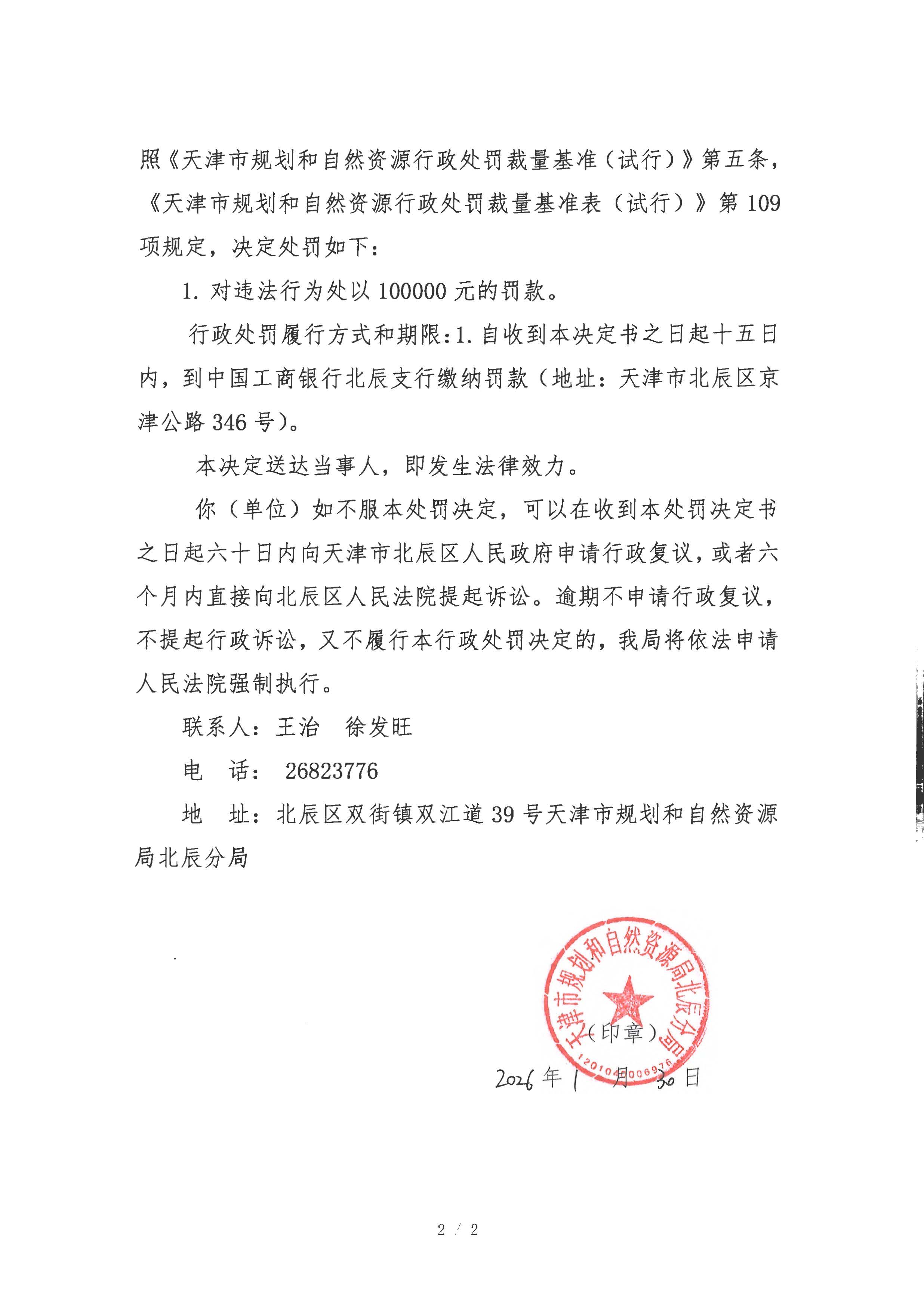 行政处罚决定书——天津御景湾投资有限公司 [北辰规资执(规划)罚﹝2026﹞1号]