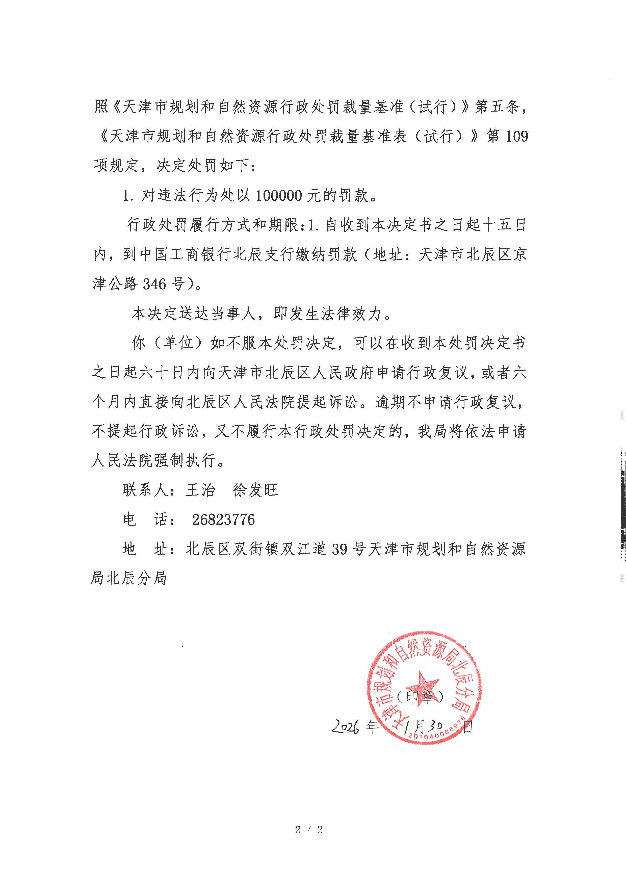 行政处罚决定书——天津御景湾投资有限公司 [北辰规资执(规划)罚﹝2026﹞2号]