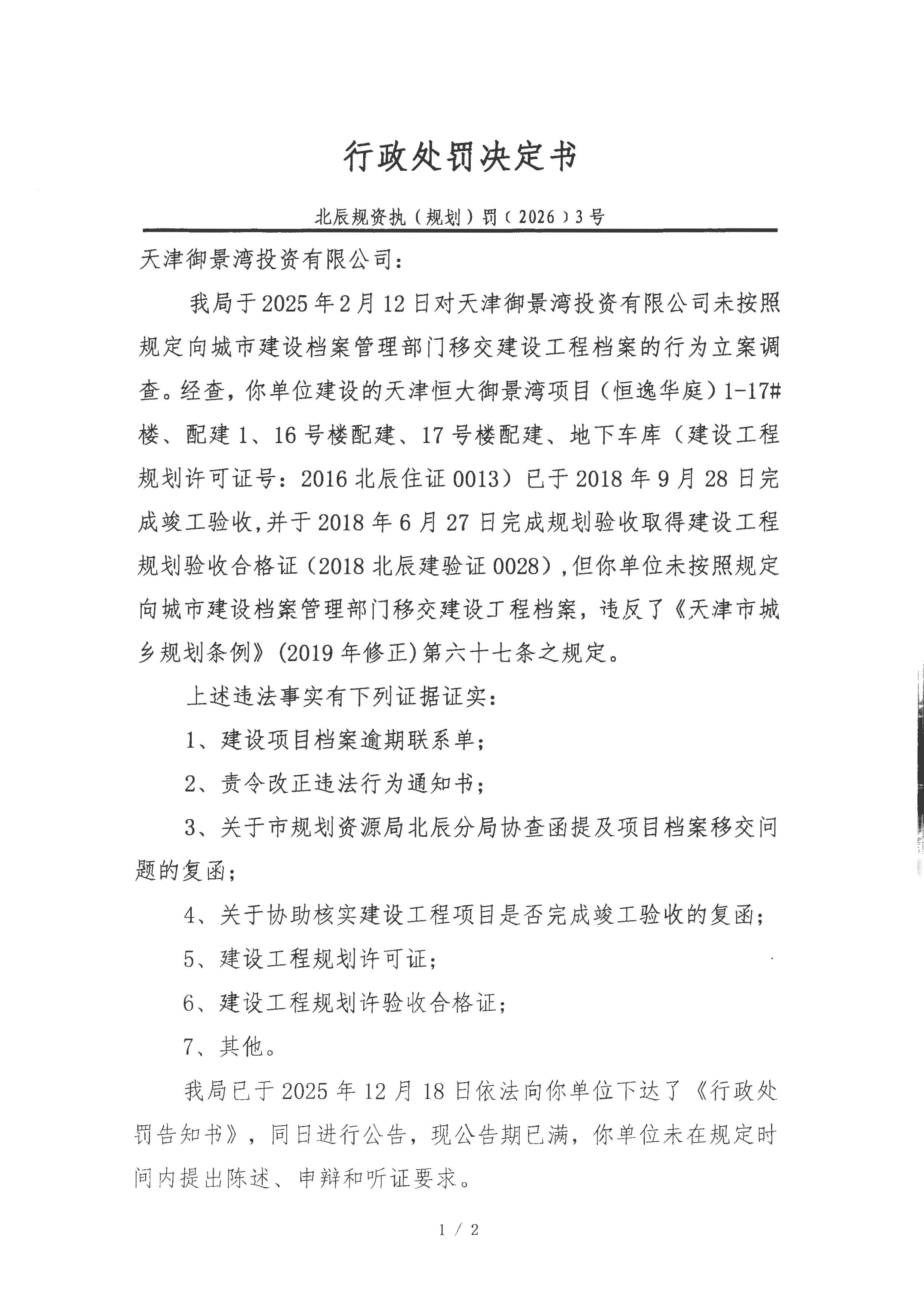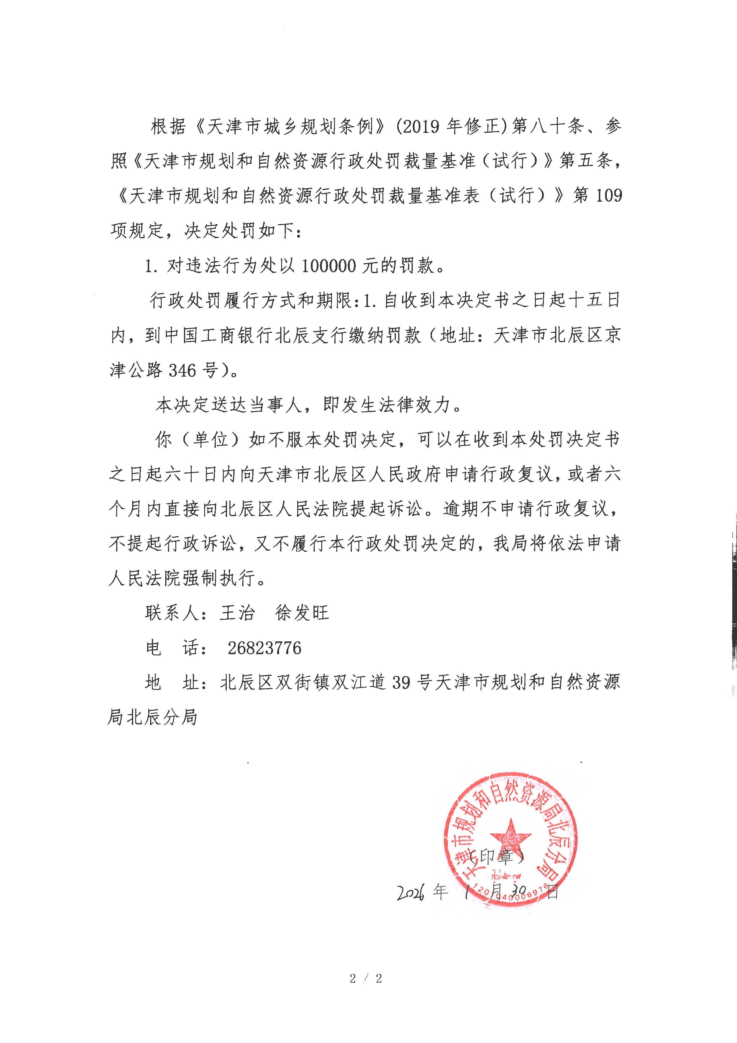 行政处罚决定书——天津御景湾投资有限公司 [北辰规资执(规划)罚﹝2026﹞3号]