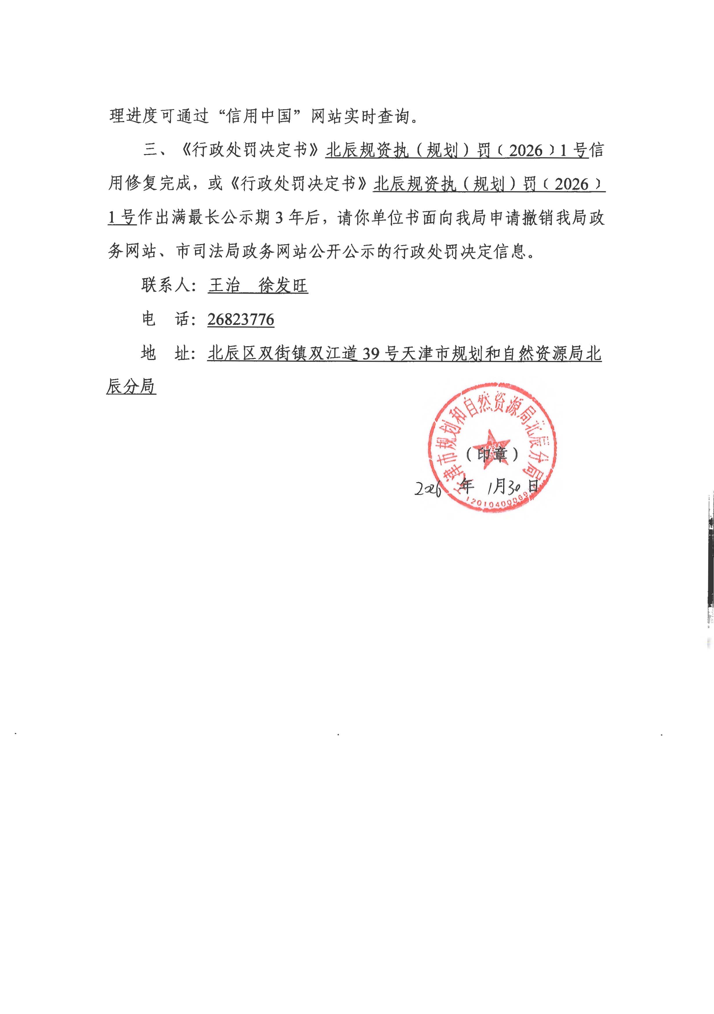 三、《行政处罚决定书》北辰规资执(规划)罚﹝2026﹞1号信用修复完成,或《行政处罚决定书》北辰规资执(规划)罚﹝2026﹞1号作出满最长公示期3年后,请你单位书面向我局申请撤销我局政务网站、市司法局政务网站公开公示的行政处罚决定信息。