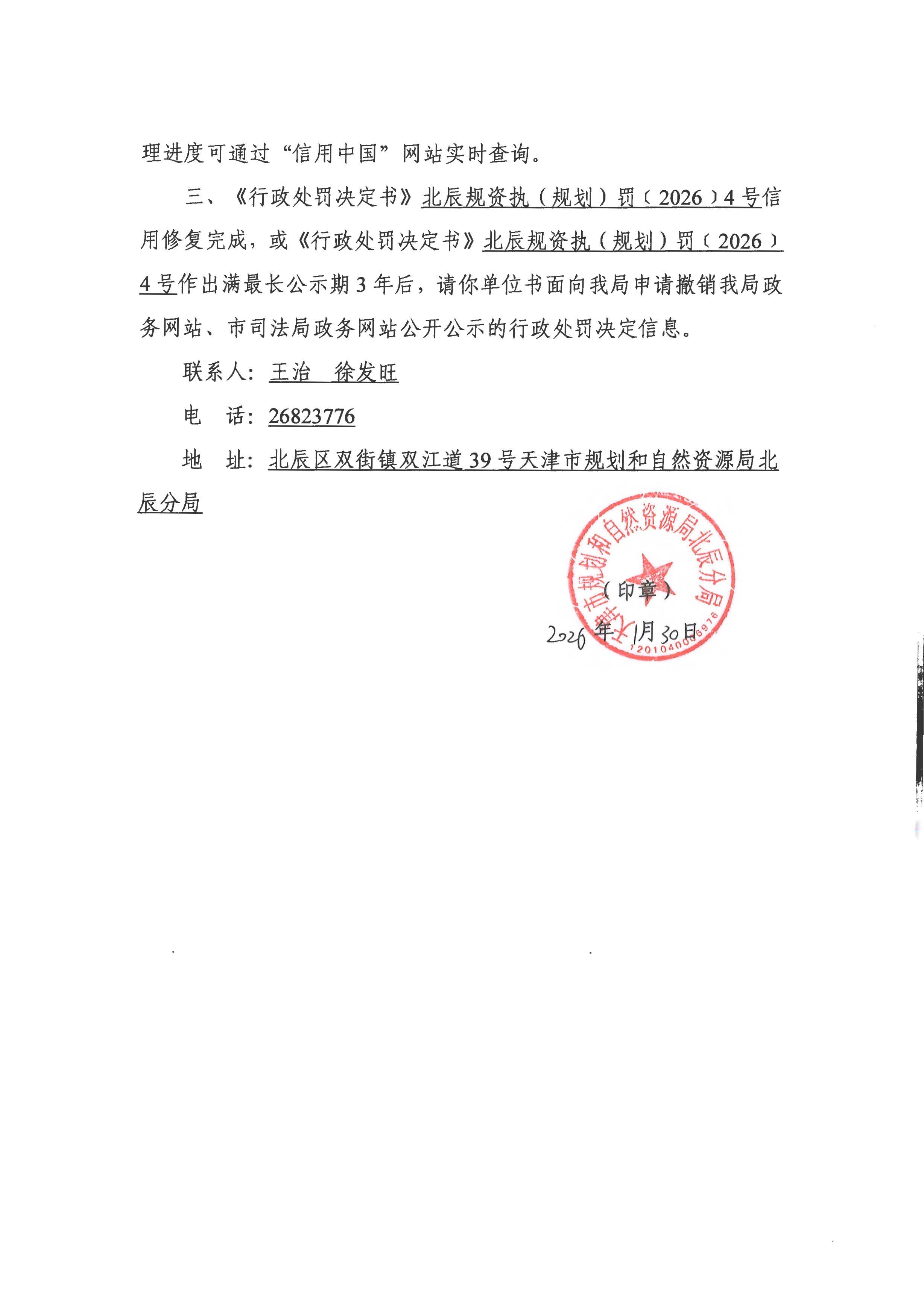三、《行政处罚决定书》北辰规资执(规划)罚﹝2026﹞4号信用修复完成,或《行政处罚决定书》北辰规资执(规划)罚﹝2026﹞4号作出满最长公示期3年后,请你单位书面向我局申请撤销我局政务网站、市司法局政务网站公开公示的行政处罚决定信息。